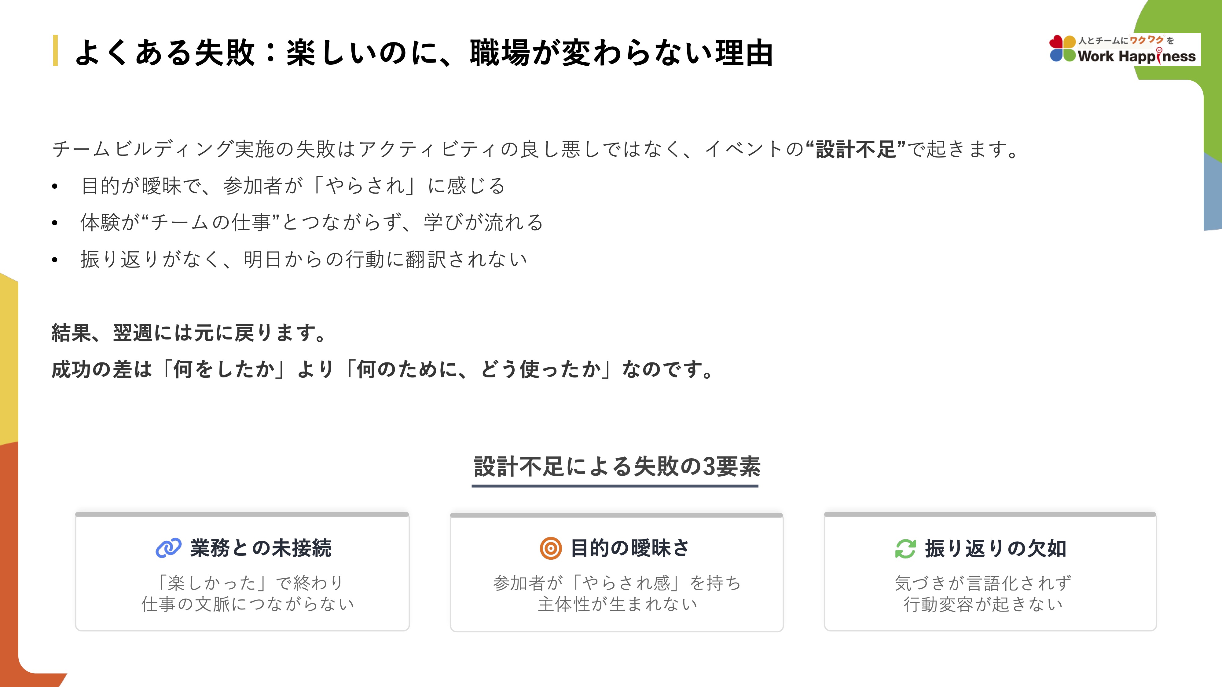 - ・チームビルディディングを成功させるための設計ポイント